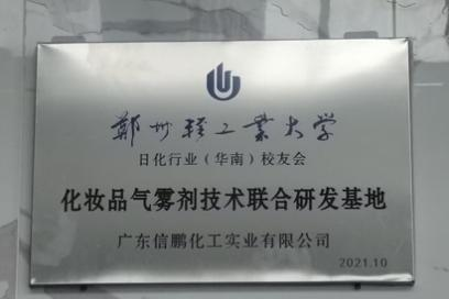 信鹏化工始终坚持人才驱动,拥有一支实力雄厚的研发团队,并设有800m² 研发品控实验室。公司是郑轻大日化行业(华南)校友会的化妆品气雾剂技术联合研发基地,同时与广东工业大学、广东石油化工学院、肇庆学院等高校和科研机构达成长期合作意向,为科技研发、产业升级提供人才和技术支持,为气雾剂行业的发展和进步做出更大的贡献。
