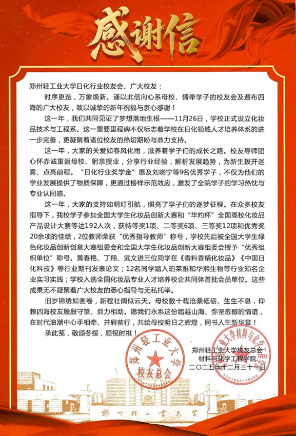 郑州轻工业大学向日化行业校友会致感谢信共贺新年