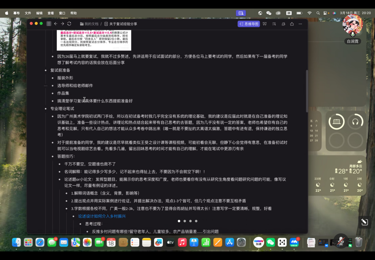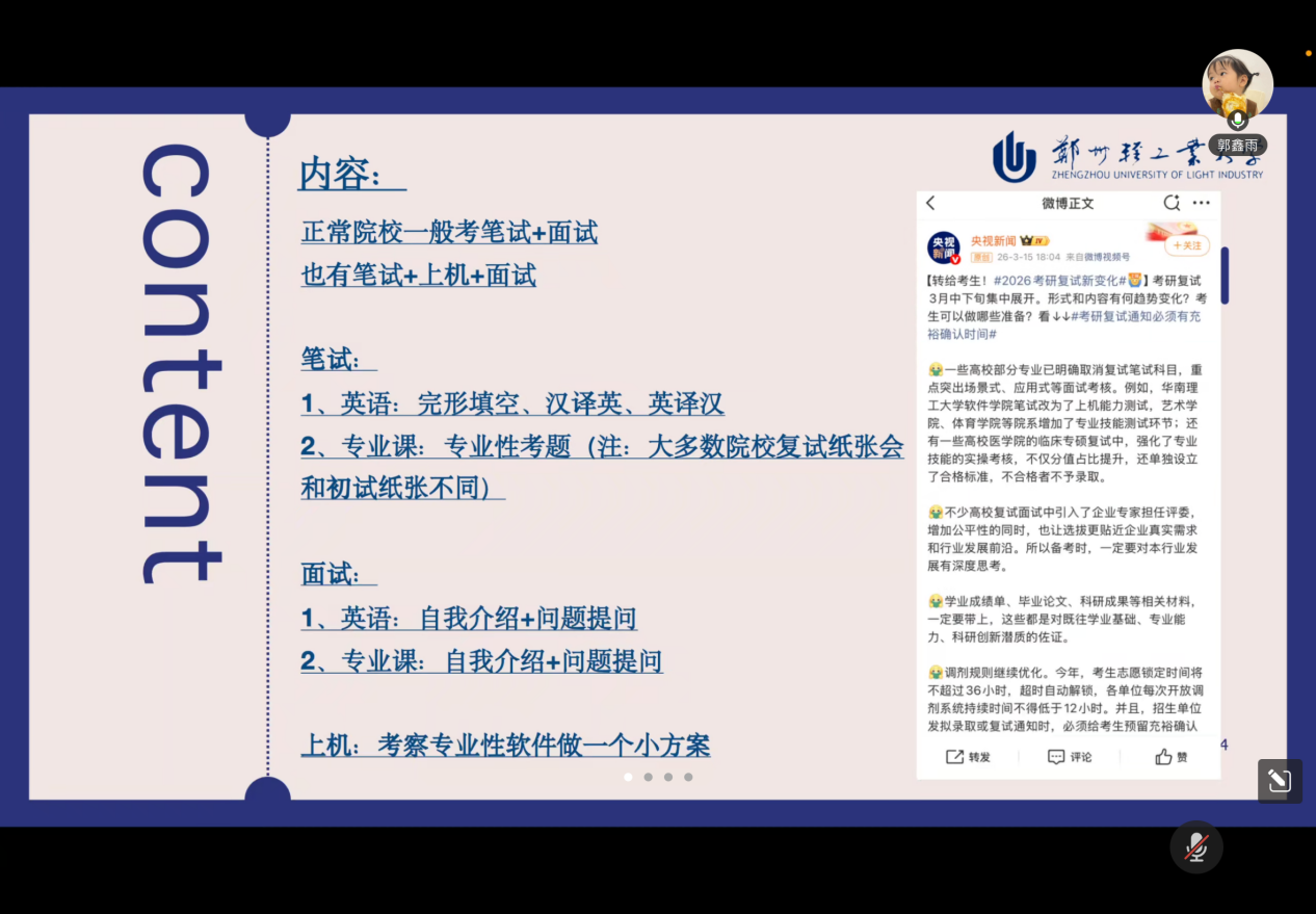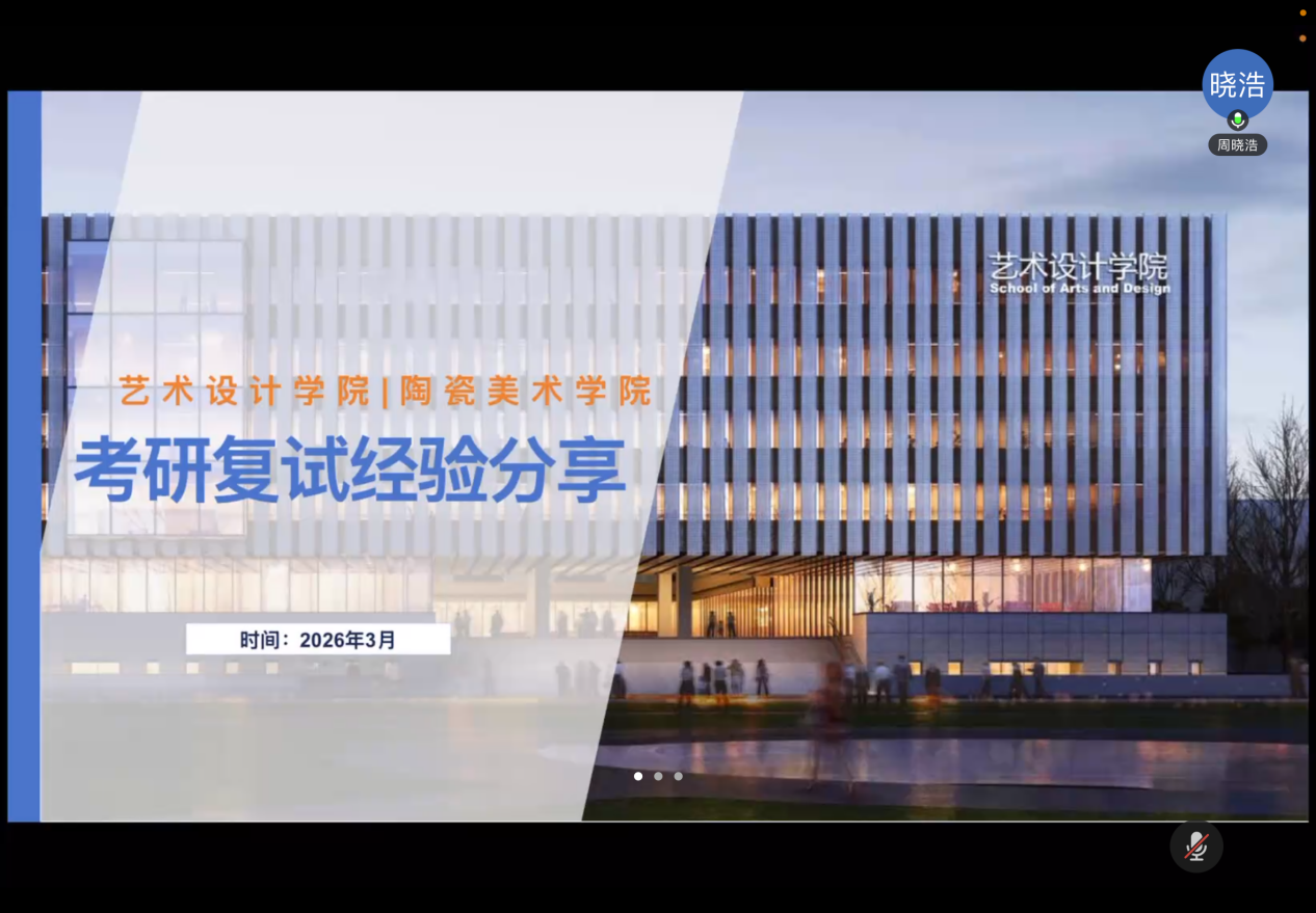 为扎实推进毕业生考研升学指导工作,全面提升学生复试竞争力,3月18日晚19时30分,艺术设计学院依托线上平台举办考研复试经验分享会。本次会议由毕业班辅导员周晓浩主持,特邀盛文艺术考研梁老师、考取广州美术学院视觉传达设计方向的2021级学生白润霓、考取本校数字媒体与动画方向的2021级学生郭鑫雨作专题分享。学院进入复试的大四学生及部分有意考研的学生参会交流。